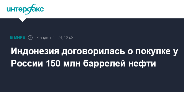 Москва. 23 апреля. INTERFAX.RU - Индонезия договорилась с Россией о поставках 150 млн баррелей российской нефти по специальной цене, пишет индонезийский еженедельник Tempo со ссылкой на специального посланника Джакарты по энергетике и окружающей среде Хашима Джоджохадикусумо.