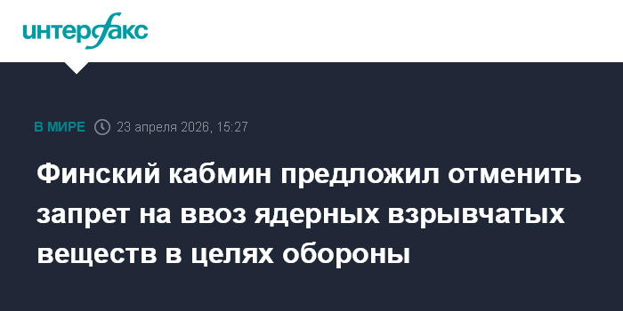 Москва. 23 апреля. INTERFAX.RU - Правительство Финляндии направило в четверг парламенту предложение о внесении законодательных поправок, отменяющих запрет на ввоз ядерных взрывчатых веществ в целях обороны.