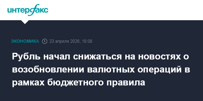Москва. 23 апреля. INTERFAX.RU - Российский рубль, колебавшийся в первой половине дня в четверг в боковом диапазоне, перешел к снижению в основных валютных парах на новостях о возобновлении Минфином операций по покупке/продаже валюты и золота в рамках бюджетного правила с мая.