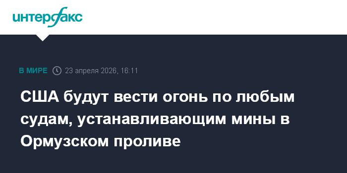 Москва. 23 апреля. INTERFAX.RU - Президент США Дональд Трамп в четверг заявил, что дал приказ ВМС США открывать огонь по любым кораблям, которые будут размещать мины в Ормузском проливе.