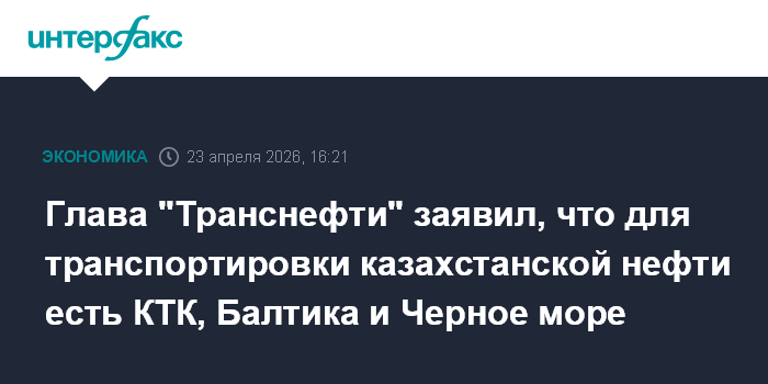 Москва. 23 апреля. INTERFAX.RU - Для казахстанской нефти, транспортировка которой в направлении Германии через Россию прекратится с 1 мая, есть много других направлений, сообщил "Интерфаксу" президент "Транснефти" Николай Токарев.