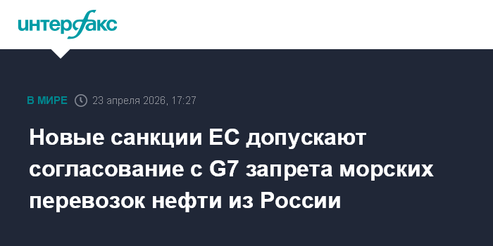 Москва. 23 апреля. INTERFAX.RU - Принятый Советом ЕС 20-й пакет санкций против России предусматривает введение в будущем запрета на транспортировку по морю российской нефти и нефтепродуктов.