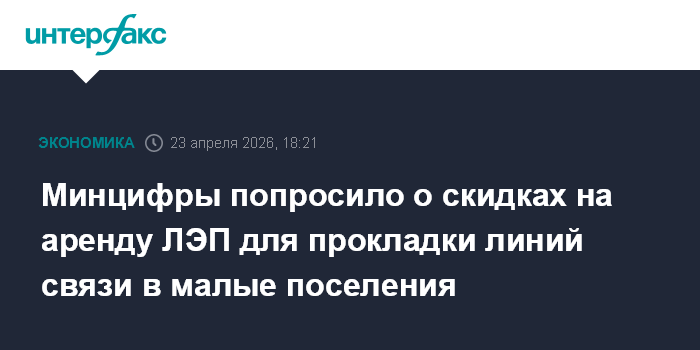 Москва. 23 апреля. INTERFAX.RU - Глава Минцифры РФ Максут Шадаев на совещании президента РФ Владимира Путина с членами правительства предложил предусмотреть скидки на аренду линий электропередачи (ЛЭП) для прокладки кабелей связи в малые населенные пункты в рамках проекта устранения цифрового неравенства (УЦН).