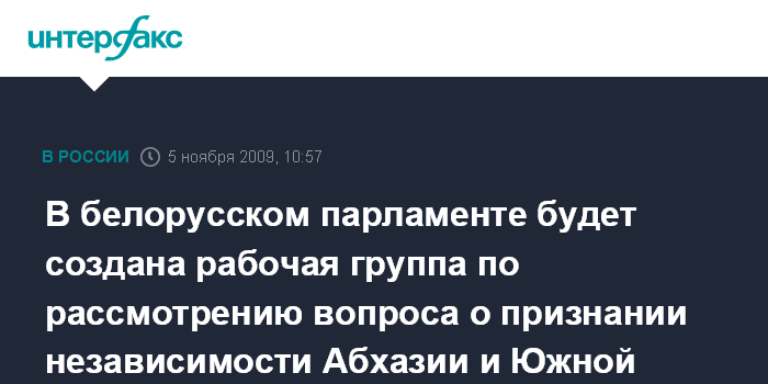 Москва. 5 ноября. INTERFAX.RU – Совет Палаты представителей Национального собрания Белоруссии принял решение в четверг в Минске создать рабочую группу по подготовке рассмотрения в белорусском парламенте обращения парламентов Южной Осетии и Абхазии, передает корреспондент агентства "Интерфакс-Запад".