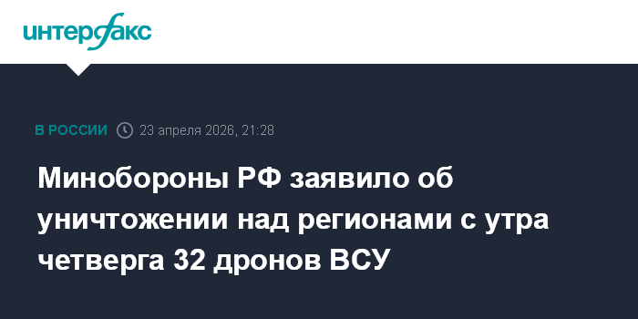 Москва. 23 апреля. INTERFAX.RU - Российские военные сбили 32 украинских беспилотника с 8:00 до 21:00 четверга, сообщило Минобороны РФ.