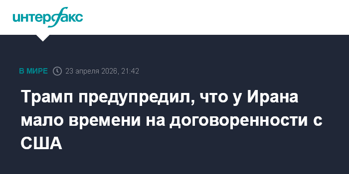 Москва. 23 апреля. INTERFAX.RU - Президент США Дональд Трамп заявил, что у Ирана остается все меньше времени на то, чтобы договориться с США.