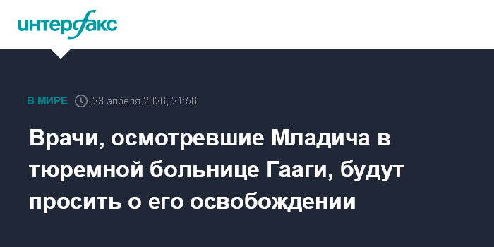 Москва. 23 апреля. INTERFAX.RU - Группа врачей из Сербии обследовала бывшего командующего главным штабом армии боснийских сербов Ратко Младича в тюремном госпитале в Гааге, сообщил в четверг агентству СРНА (Республика Сербская в составе Боснии и Герцеговины) его сын Дарко.