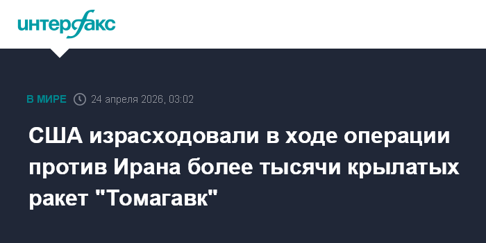 Москва. 24 апреля. INTERFAX.RU - Пентагон, по последним данным, использовал в ходе проведения военной операции против Ирана более тысячи крылатых ракет Tomahawk с дальностью 1,6 тыс. км, что значительно истощило запасы этого высокоточного оружия в американских арсеналах, сообщает газета The Wall Street Journal, ссылаясь на информированных американских чиновников.