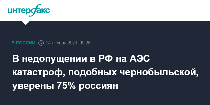 Москва. 24 апреля. INTERFAX.RU - Большинство россиян (75%) считают, что современные атомные электростанции в РФ гарантируют безопасность населения и недопущение катастроф, подобных аварии на Чернобыльской АЭС 26 апреля 1986 года, свидетельствуют данные опроса Аналитического центра ВЦИОМ.