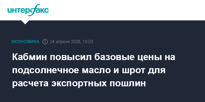 Москва. 24 апреля. INTERFAX.RU - Правительство РФ повысило базовые экспортные цены на подсолнечное масло и подсолнечный шрот, на основе которых рассчитываются экспортные пошлины.