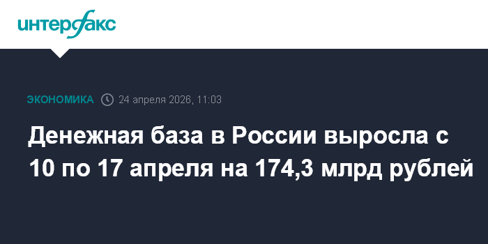 На 10 апреля денежная база в России равнялась 20343,4 млрд рублей. Таким образом, за период она выросла на 0,85%, или на 174,3 млрд рублей.