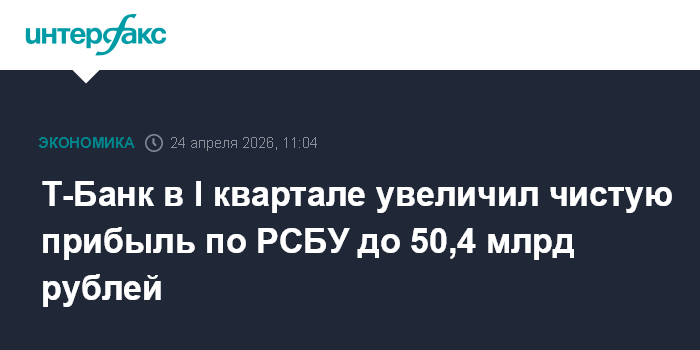 Москва. 24 апреля. INTERFAX.RU - Т-Банк в I квартале 2026 года увеличил чистую прибыль по РСБУ до 50,4 млрд рублей, говорится в сообщении материнской компании - "Т-Технологии".