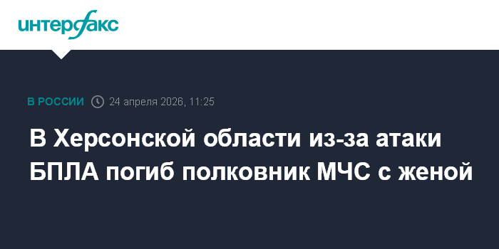 Москва. 24 апреля. INTERFAX.RU - В Херсонской области в результате атаки БПЛА погибли сотрудник ГУ МЧС по региону, полковник внутренней службы Иван Бузин и его жена, сообщило региональное управлние МЧС.