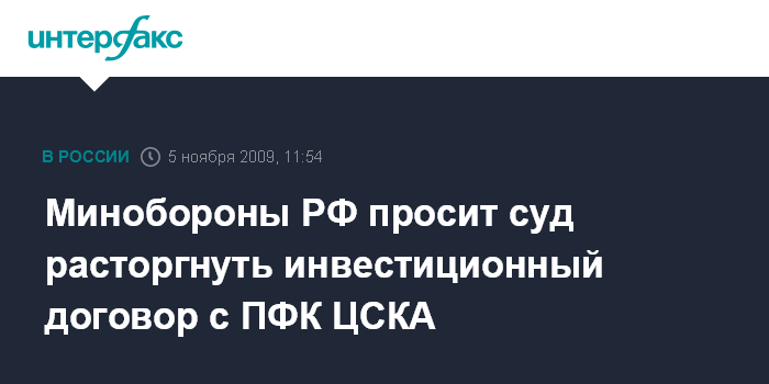 Москва. 5 ноября. INTERFAX.RU - Федеральное государственное учреждение (ФГУ) Минобороны РФ ЦСКА подало в арбитражный суд Москвы иск с требованием расторгнуть инвестиционный договор, по которому профессиональному футбольному клубу (ПФК) ЦСКА передавался земельный участок в 9 га под строительство футбольной арены.