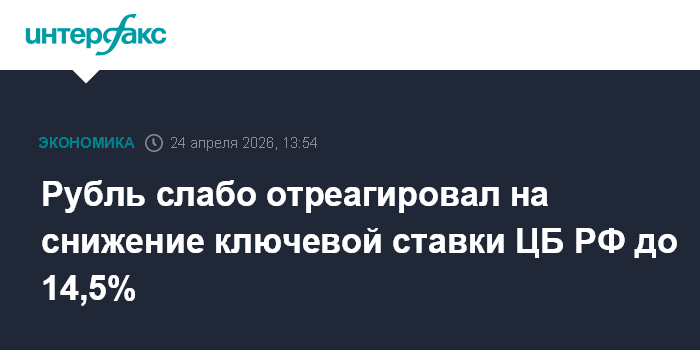 Москва. 24 апреля. INTERFAX.RU - Российский рубль слабо отреагировал на решение Банка России снизить ключевую ставку на апрельском заседании на 50 базисных пунктов - до 14,5% годовых, так как оно было ожидаемо рынком и уже учтено в текущих котировках нацвалюты.