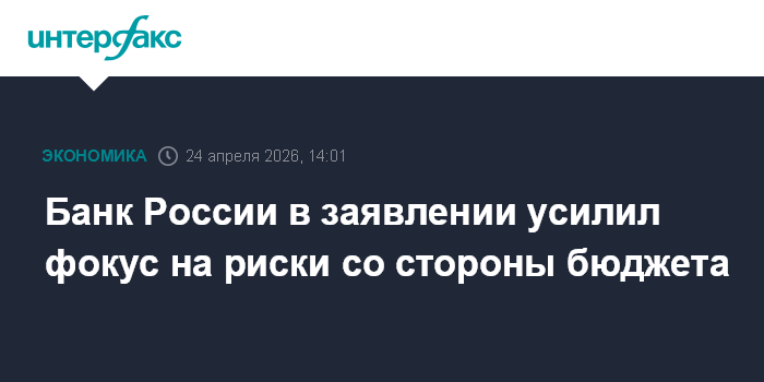 Москва. 24 апреля. INTERFAX.RU - Банк России в своем заявлении по итогам апрельского заседания совета директоров усилил фокус на риски для денежно-кредитной политики со стороны бюджета.