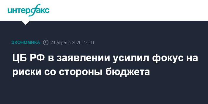Москва. 24 апреля. INTERFAX.RU - Банк России в своем заявлении по итогам апрельского заседания совета директоров усилил фокус на риски для денежно-кредитной политики со стороны бюджета.