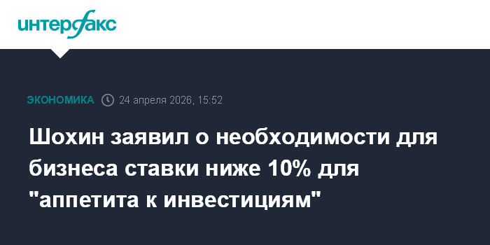 "Когда я призывал на 1 процентный пункт снижать ставку, я имел в виду, что к концу года можно выйти на 10%, а может быть даже уйти на однозначную цифру. Именно эти показатели с точки зрения бизнеса, и не только крупного, но и среднего, и малого, делают чувствительным вот этот уровень к формированию того, что иногда называют инвестиционным аппетитом, аппетитом к инвестициям", - сказал Шохин в эфире радиостанции Business FM.