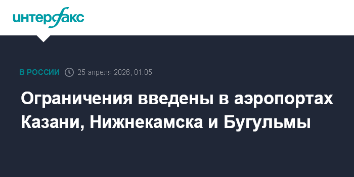 Москва. 25 апреля. INTERFAX.RU - Временные ограничения на прием и выпуск воздушных судов введены в аэропортах Казани, Нижнекамска и Бугульмы, сообщает ГУ МЧС России по Республике Татарстан в своем канале в Мах.