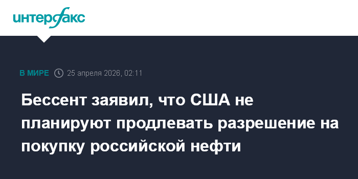 Москва. 25 апреля. INTERFAX.RU - Администрация США не планирует еще раз продлевать лицензию, разрешающую странам покупку нефти РФ, заявил глава Минфина США Скотт Бессент.