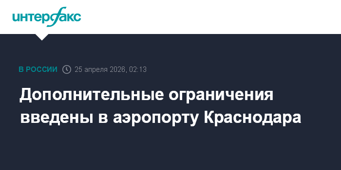 Москва. 25 апреля. INTERFAX.RU - Введены дополнительные временные ограничения на прием и выпуск воздушных судов в аэропорту Краснодара, сообщает Росавиация в своем канале в Мах.