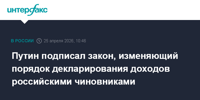 Москва. 25 апреля. INTERFAX.RU - Президент РФ Владимир Путин подписал закон, согласно которому госслужащие должны будут предоставлять сведения об общем доходе своем, супруги и несовершеннолетних детей, а не о доходе каждого члена семьи по отдельности.
