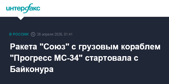 Москва. 26 апреля. INTERFAX.RU - Ракета-носитель "Союз-2.1а" с транспортным кораблем "Прогресс МС-34" с грузами для Международной космической станции (МКС) стартовала с космодрома Байконур, следует из трансляции "Роскосмоса".