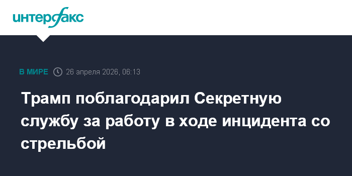 Москва. 26 апреля. INTERFAX.RU - Президент США Дональд Трамп поблагодарил сотрудников Секретной службы США и других служб безопасности за эффективную работу в ходе инцидента со стрельбой в Вашингтоне.