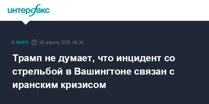 Москва. 26 апреля. INTERFAX.RU - Президент США Дональд Трамп предположил, что произошедший в Вашингтоне инцидент со стрельбой не имеет отношения к иранскому кризису.