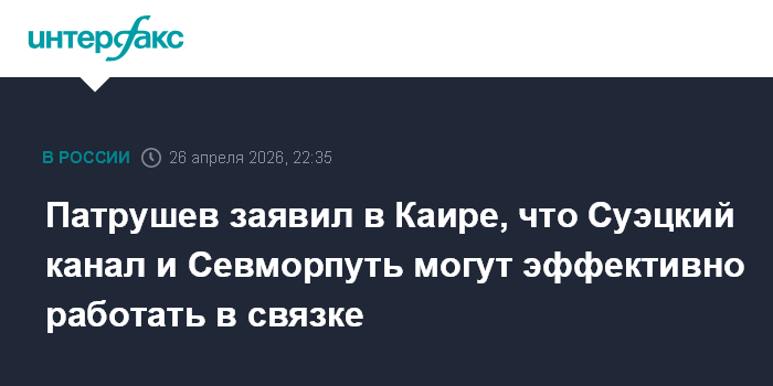 "Россия и Египет в силу своего уникального географического положения являются важнейшими звеньями мировой логистической архитектуры. Расчеты российских специалистов показывают, что Суэцкий канал и Трансарктический транспортный коридор способны эффективно работать в связке", - сказал Патрушев.