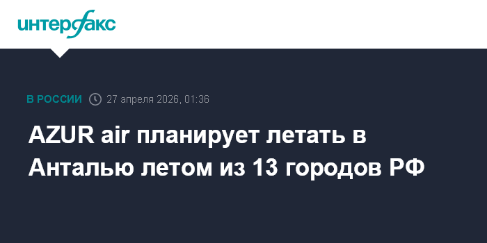 Москва. 27 апреля. INTERFAX.RU - Авиакомпания AZUR air в летнем расписании планирует выполнять рейсы в турецкую Анталью из 13 городов России.