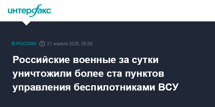Москва. 27 апреля. INTERFAX.RU - Группировки войск "Запад", "Южная", "Север" и "Восток" за сутки уничтожили 112 пунктов управления беспилотниками армии Украины, заявили российские военные в понедельник.