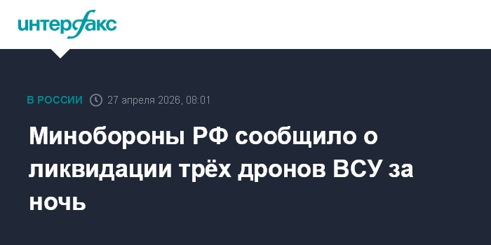 Москва. 27 апреля. INTERFAX.RU - Российские военные в ночь на понедельник перехватили и уничтожили три украинских БПЛА, заявило Минобороны РФ.
