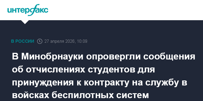 Москва. 27 апреля. INTERFAX.RU - Заместитель министра науки и высшего образования Российской Федерации Дмитрий Афанасьев опроверг сообщения о якобы массовых отчислениях студентов с целью принуждения к заключению контракта для службы в войсках беспилотных систем.
