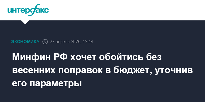 Москва. 27 апреля. INTERFAX.RU - Минфин РФ предлагает весной не вносить поправки в закон о бюджете на 2026 год и плановый период 2027-2028 годов, уточнив его параметры в рамках полномочий правительства, сообщил журналистам министр финансов Антон Силуанов.