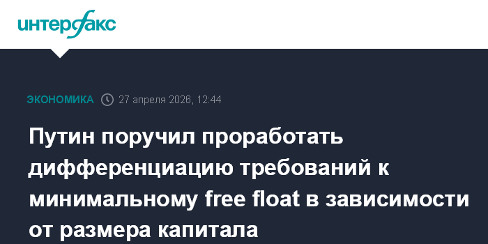 Москва. 27 апреля. INTERFAX.RU - Президент Владимир Путин поручил правительству вместе с Банком России подготовить и представить совместные предложения по дифференциации в зависимости от размера капитала эмитента требований к необходимой минимальной доле акций в свободном обращении (free float), устанавливаемой для включения в котировальные списки "Московской биржи".