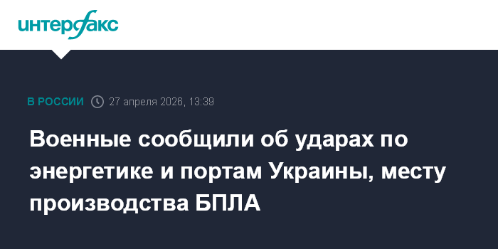 Москва. 27 апреля. INTERFAX.RU - Российские военные нанесли удары по используемым ВСУ объектам энергетической и портовой инфраструктуры Украины, месту производства беспилотников дальнего действия, сообщили в Минобороны РФ в понедельник.
