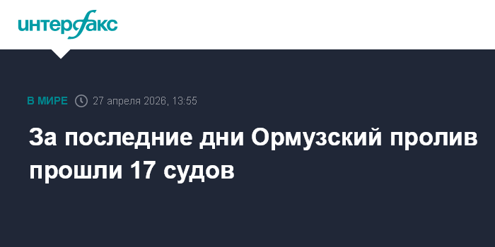 Москва. 27 апреля. INTERFAX.RU - Не менее 17 судов, включая четыре загруженных танкера, с пятницы по понедельник миновало Ормузский пролив, сообщает CNN со ссылкой на данные компании Kpler.