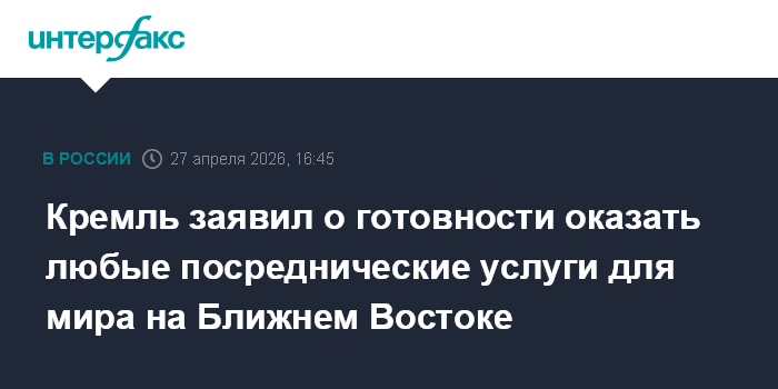 Москва. 27 апреля. INTERFAX.RU - Россия готова оказать любые посреднические услуги для урегулирования конфликта вокруг Ирана и установления гарантированного мира на Ближнем Востоке, заявил пресс-секретарь президента РФ Дмитрий Песков.