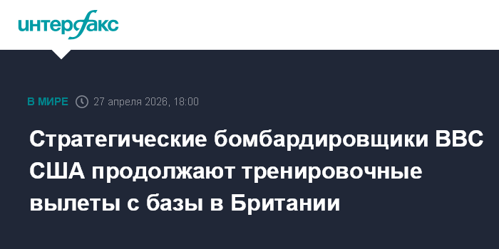 Москва. 27 апреля. INTERFAX.RU - Стратегические бомбардировщики ВВС США продолжают осуществлять тренировочные вылеты с передовой авиабазы Фэрфорд Великобритании, которая в ходе американской военной операции использовалась для нанесения ударов по Ирану, следует из данных авиационного ресурса Military Air Tracking Alliance (MATA).