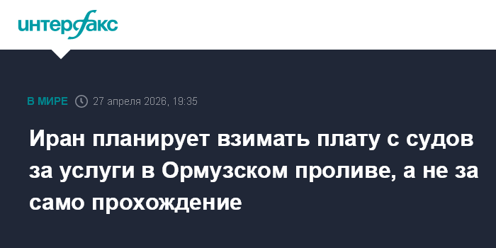 Москва. 27 апреля. INTERFAX.RU - Иранский законопроект по Ормузскому проливу предусматривает сборы с судов за обслуживание, предоставляемое им во время движения через пролив, сообщает в понедельник The Guardian.