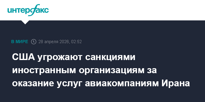 Москва. 28 апреля. INTERFAX.RU - Министр финансов США Скотт Бессент заявил, что иностранные организации, предоставляющие услуги авиакомпаниям Ирана, могут столкнуться с американскими санкциями.
