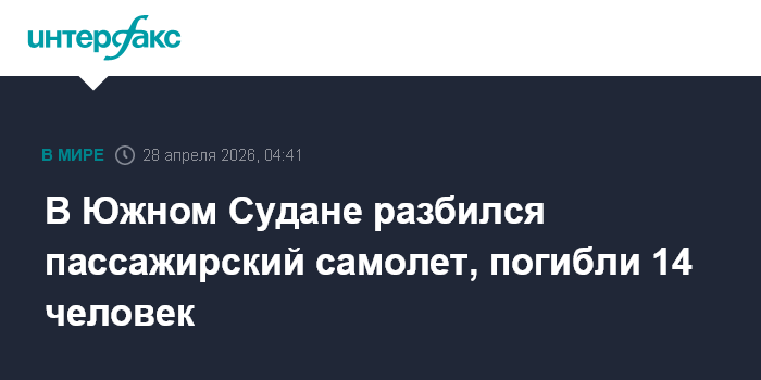 Москва. 28 апреля. INTERFAX.RU - В Южном Судане разбился пассажирский самолет Cessna 208 Caravan авиакомпании CityLink Aviation, погибли 14 человек, сообщила Al Jazeera со ссылкой на управление гражданской авиации страны.