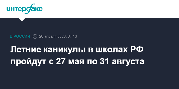 Летние каникулы в школах РФ пройдут с 27 мая по 31 августа
