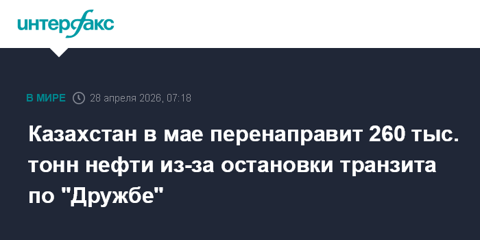 Ранее глава Минэнерго Казахстана Ерлан Аккенженов сообщал, что по неофициальным каналам получил информацию о том, что Россия в мае приостанавливает транзит казахстанской нефти по системе "Дружба" в направлении Германии.