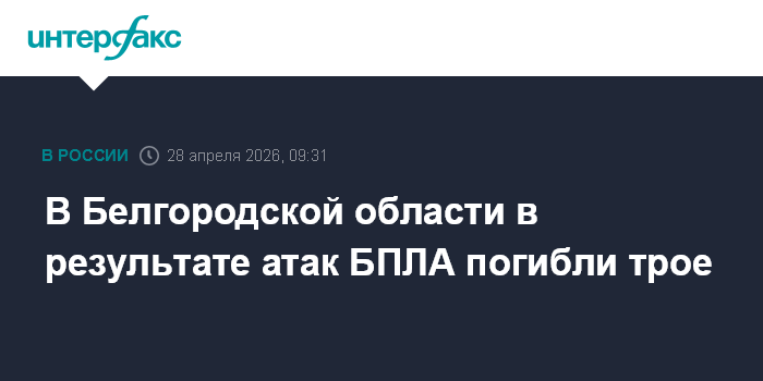 Москва. 28 апреля. INTERFAX.RU - В Белгородской области в результате атак БПЛА погибли три человека, сообщил губернатор региона Вячеслав Гладков. Еще трое ранены, среди них 16-летний подросток.