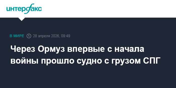 Москва. 28 апреля. INTERFAX.RU - Мониторинговые ресурсы впервые с начала конфликта на Ближнем Востоке два месяца назад зарегистрировали проход танкера-газовоза со сжиженным природным газом через Ормузский пролив, передает Bloomberg.