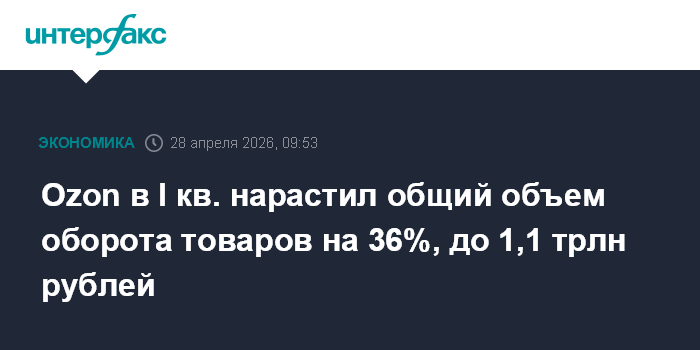 Москва. 28 апреля. INTERFAX.RU - Группа Ozon по итогам I квартала 2026 года получила общий объем оборота товаров (GMV), включая услуги, в размере 1,14 трлн рублей, что на 36% превышает показатель аналогичного периода 2025 года, говорится в сообщении компании.