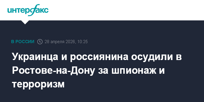 Москва. 28 апреля. INTERFAX.RU - Южный окружной военный суд в Ростове-на-Дону признал гражданина Украины и гражданина России виновными в терроризме и шпионаже, сообщает пресс-служба суда.