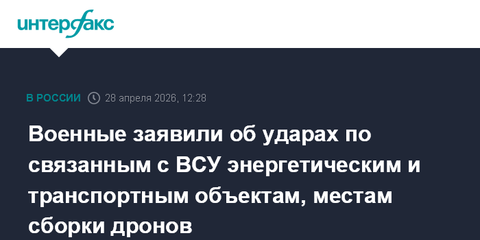 Москва. 28 апреля. INTERFAX.RU - Российская армия в течение суток нанесла удары по энергетическим и транспортным объектам, которые используются в интересах вооруженных сил Украины, и местам сборки украинских дронов, сообщили в Минобороны РФ во вторник.